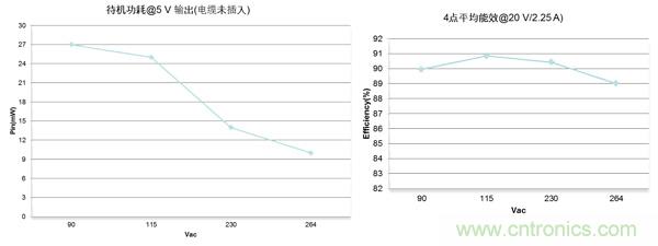 我們在90 Vac、115 Vac、230 Vac、264 Vac 條件下,測得該方案于5 V輸出(電纜未插入)的待機(jī)功耗都低于27 mW,在評估板端測得在115 Vac和230 Vac的條件下,20 V/2.25 A輸出的平均能效超過90%。