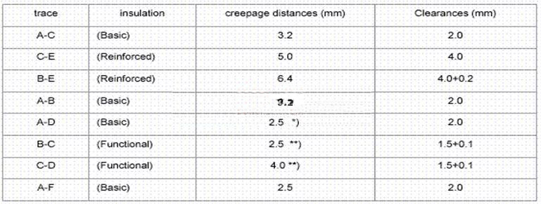 對于電路中各位置對大地,即交流輸入LN對地,整流后高壓直流對大地,原邊地對大地,副邊對大地等,全部需要采用基本絕緣;對于一次DC-DC線路內(nèi)部器件,由于不存在電擊風(fēng)險,只需要采用功能絕緣,保證電路正常工作,降低擊穿、打火風(fēng)險;而對于一次電路對二次電路,如圖中BC對E,必須要采用加強絕緣,防止人員在接觸到二次電路時,具有危險性的一次電路造成電擊。