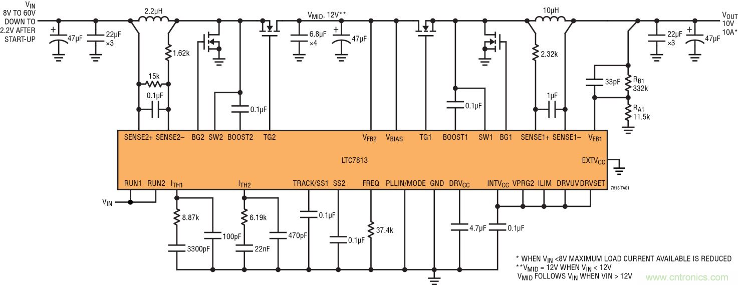 圖 5:LTC7813 原理圖 ~~ 一個(gè)級聯(lián)的升壓及降壓型單輸出控制器 IC