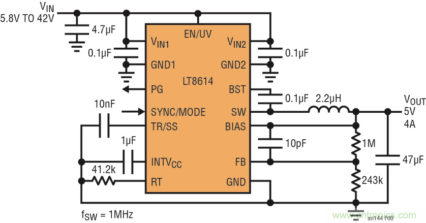 一個(gè)很好的例子是 LT8609,這是一款 2A、42V 輸入同步降壓型開關(guān)穩(wěn)壓器。獨(dú)特的同步整流拓?fù)涮峁?93% 的效率,而以 2MHz 頻率切換使設(shè)計(jì)師能夠避開關(guān)鍵噪聲敏感頻段,例如 AM 無線電,同時(shí)可提供占板面積非常緊湊的解決方案。突發(fā)模式 (Burst Mode®) 運(yùn)行在無負(fù)載備用情況下保持靜態(tài)電流低于 2.5μA,從而使該器件非常適合始終保持接通的系統(tǒng)。LT8609 的 3.0V 至 42V 輸入電壓范圍使其非常適合汽車應(yīng)用,這類應(yīng)用必須以低至 3.0V 的最低輸入電壓穩(wěn)定通過冷車發(fā)動(dòng)和停-啟情況,并穩(wěn)定通過超過 40V 的負(fù)載瞬態(tài)。其內(nèi)部 3.5A 開關(guān)可在峰值負(fù)載電流為 3A 時(shí),提供高達(dá) 2A 的連續(xù)輸出電流。原理圖和相應(yīng)于 2MHz 切換頻率的效率曲線如圖 3 所示。