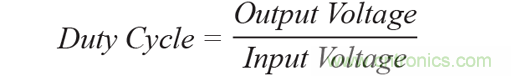 如果將一個降壓轉(zhuǎn)換器(降壓器)用于此單一轉(zhuǎn)換步驟,如圖1所示,會出現(xiàn)小占空比的問題。占空比反映導通時間(當主開關導通時)和斷開時間(當主開關斷開時)之間的關系。降壓轉(zhuǎn)換器的占空比由以下公式定義: