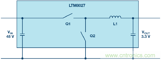 圖1.通過單一轉(zhuǎn)換步驟將電壓從48 V降至3.3 V。