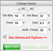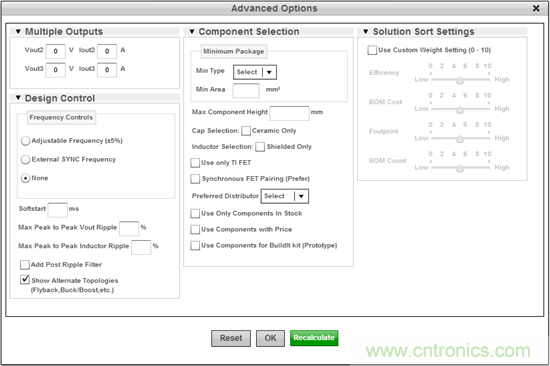 單擊“Use Advanced Options”(使用高級(jí)選項(xiàng))來(lái)打開(kāi)Advanced Options菜單(圖3)。在Design Control(設(shè)計(jì)控制)項(xiàng)下,確保“Show Alternate Topologies”(顯示替代拓?fù)洌?fù)選框被選中,這樣將列出所有可能的Fly-Buck解決方案。在你確認(rèn)復(fù)選框的選擇后,單擊“Recalculate”(重新計(jì)算)按鈕來(lái)繼續(xù)。