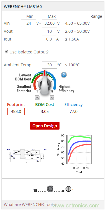 在第二個(gè)方法中,你需要確定打算在Fly-Buck設(shè)計(jì)中使用的器件。比如說(shuō),你打算在Fly-Buck設(shè)計(jì)中使用LM5160。在LM5160產(chǎn)品文件夾中,你將會(huì)找到一個(gè)專(zhuān)門(mén)為這個(gè)器件創(chuàng)建的WEBENCH設(shè)計(jì)工具控制面板(圖4)。