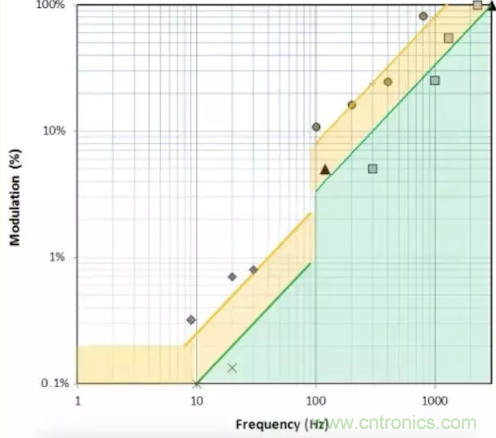 電氣和電子工程師協(xié)會1789-2015年標(biāo)準(zhǔn)首次提出降低人體健康風(fēng)險的全面建議。上圖顯示的是對人體健康風(fēng)險較低或無明顯風(fēng)險(綠色部分)的整個頻率范圍內(nèi)的頻閃限值曲線?! ?/div>