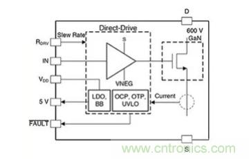 eGaN 價(jià)格降低使芯片制造商能夠解決這兩個(gè)問(wèn)題。例如,Texas Instruments 在其 LMG3411R070 的集成柵極驅(qū)動(dòng)中集成了70 毫歐姆 (mΩ)、600 伏 eGaN 功率級(jí)(圖 2)。