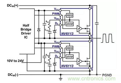 圖4:如圖所示,Navitas 的 NV6113 可并行部署,用于半橋拓?fù)浣Y(jié)構(gòu)。(圖片來(lái)源:Navitas Semiconductor)