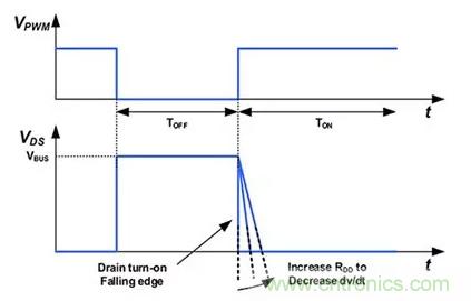 圖6:RDD 電阻器的大小決定了 NV6113 導(dǎo)通電流和功率 FET 漏極的導(dǎo)通(下降)沿壓擺率。(圖片來(lái)源:Navitas Semiconductor)