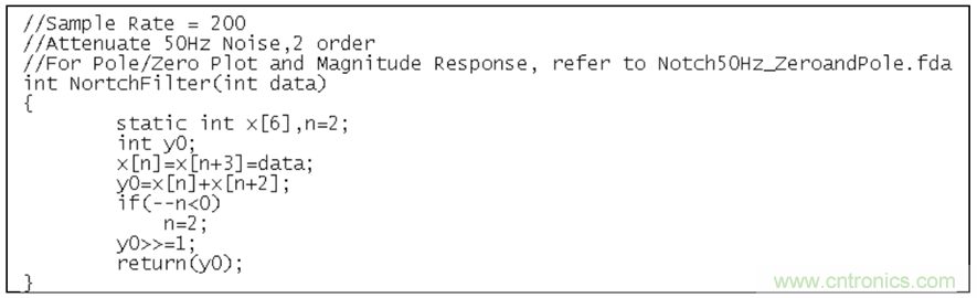 圖5顯示了HRM的模擬輸出。我們可以看到從220 V電力線 耦合而來的50 Hz噪聲。采集到的信號可以通過微型轉(zhuǎn)換器 中的數(shù)字陷波濾波器處理。為此,我們根據(jù)200 Hz的采樣 頻率,設(shè)計了一個二階FIR濾波器。陷波濾波器采用極點 零點放置方法,用于抑制50 Hz干擾。