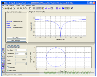 圖6. 數(shù)字陷波濾波器旨在消除噪聲 (運用來自MATLAB的FDATool工具)
