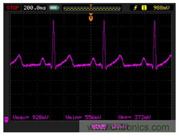 圖5. 監(jiān)護(hù)儀模擬輸出端顯示出從電力線耦合而來的噪聲