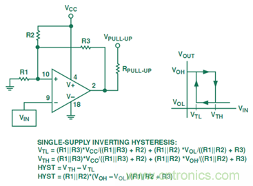 參考圖3, R1 = 5.1 k?, R2 = R3 = 2.4 M?, VCC = 3.3 V, VOL = 0 V, VOH = 3.3 V. 我們用圖4中的公式計算: