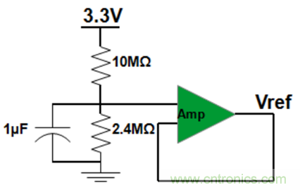 圖2. 電阻分壓器和緩沖器產(chǎn)生0.625 V基準(zhǔn)電壓