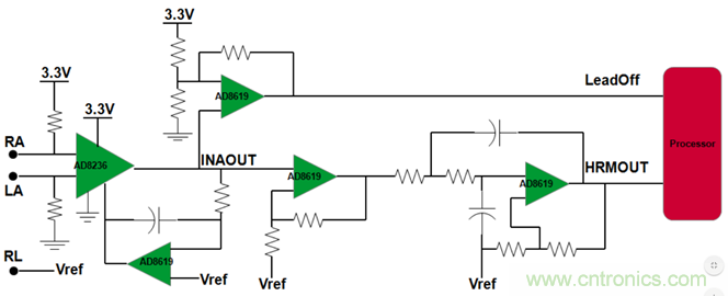圖3. 儀表放大器輸出連接至導(dǎo)聯(lián)脫落檢測電路的輸入端
