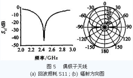 當(dāng)單個(gè)振子臂的長(zhǎng)度l =λ/ 4 時(shí)(半波振子) ,輸入阻抗的電抗分量為零,天線輸入阻抗可視為一個(gè)純電阻. 在忽略天線粗細(xì)的橫向影響下,簡(jiǎn)單的偶極子天線設(shè)計(jì)可以取振子的長(zhǎng)度l 為λ/ 4 的整數(shù)倍,如工作頻率為2. 45 GHz 的半波偶極子天線,其長(zhǎng)度約為6 cm.當(dāng)要求偶極子天線有較大的輸入阻抗時(shí),可采用圖4b的折合振子.
