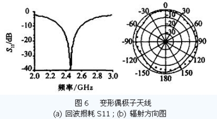 從圖5b 可以看到在天線軸方向上,天線幾乎無(wú)輻射. 如果此時(shí)讀寫器處于該方向上,應(yīng)答器將不會(huì)做出任何反應(yīng). 為了獲得全方位輻射的天線以克服該缺點(diǎn),可以對(duì)天線做適當(dāng)?shù)淖冃?如在將偶極子天線臂末端垂直方向上延長(zhǎng)λ/ 4 成圖4c 所示. 這樣天線總長(zhǎng)度修改為(57. 0 mm + 2 ×28. 5 mm) ,天線臂寬仍然為1 mm. 天線臂延長(zhǎng)λ/ 4 后,整個(gè)天線諧振于1 個(gè)波長(zhǎng),而非原來(lái)的半個(gè)波長(zhǎng). 這就使得天線的輸入阻抗大大地增加,仿真計(jì)算結(jié)果約為2 kΩ. 其輸入回波損耗S11如圖6a 所示. 圖6b 為E 面(天線平面) 上的輻射場(chǎng)方向圖,其中實(shí)線為仿真結(jié)果,黑點(diǎn)為實(shí)際樣品測(cè)量數(shù)據(jù),兩者結(jié)果較為吻合說(shuō)明了該設(shè)計(jì)是正確的. 從圖6b 可以看到在原來(lái)弱輻射的方向上得到了很大的改善,其輻射已經(jīng)近似為全方向的了. 電壓駐波比(VSWR) 小于2. 0 時(shí)的阻抗帶寬為12.2 % ,增益為1.4 ,對(duì)于大部分RFID 應(yīng)用系統(tǒng),該偶極子天線可以滿足要求.