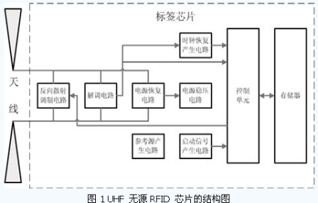如圖1 所示,一個完整超高頻無源RFID 標(biāo)簽由天線和標(biāo)簽芯片兩部分組成,其中,標(biāo)簽芯片一般包括以下幾部分電路:電源恢復(fù)電路、電源穩(wěn)壓電路、反向散射調(diào)制電路、解調(diào)電路、時鐘提取/產(chǎn)生電路、啟動信號產(chǎn)生電路、參考源產(chǎn)生電路、控制單元、存儲器。