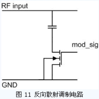 無源UHF RFID 標(biāo)簽一般采用反向散射的調(diào)制方法,即通過改變芯片輸入阻抗來改變芯片與天線間的反射系數(shù),從而達(dá)到調(diào)制的目的。一般設(shè)計(jì)天線阻抗與芯片輸入阻抗使其在未調(diào)制時接近功率匹配,而在調(diào)制時,使其反射系數(shù)增加。常用的反向散射方法是在天線的兩個輸入端間并聯(lián)一個接有開關(guān)的電容,如圖11 所示,調(diào)制信號通過控制開關(guān)的開啟,決定了電容是否接入芯片輸入端,從而改變了芯片的輸入阻抗。