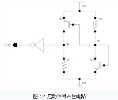 該電路仍然存在的靜態(tài)功耗的問題,可以通過增大電阻值,合理選擇MOS 管尺寸來降低靜態(tài)功耗的影響。要想完全解決靜態(tài)功耗的問題則需要設(shè)計(jì)額外的反饋控制電路,在啟動信號產(chǎn)生后關(guān)斷這部分電路。但是,需要特別注意引入反饋后產(chǎn)生的不穩(wěn)定態(tài)的問題。