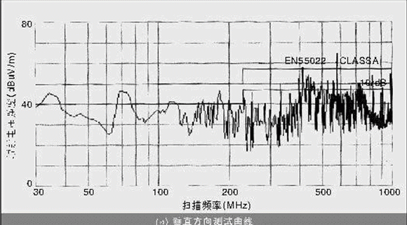 按照接入設(shè)備的電磁兼容(EMC)測(cè)試要求,設(shè)備上電正常運(yùn)行,測(cè)試儀器在30~1 000 MHz的頻率范圍內(nèi)進(jìn)行掃描,其中在30~230 MHz頻率范圍內(nèi)要求電磁干擾(EMI)的準(zhǔn)峰值低于40 dBuV/m,在230~1000 MHz頻率范圍內(nèi),EMI的準(zhǔn)峰值低于47 dBuV/m。測(cè)試的結(jié)果是:在垂直方向上,412.5 MHz處超標(biāo)4.08 dB,577.5 MHz處超標(biāo)3.5 dB;在水平方向上,577.5 MHz處超標(biāo)7.9 dB,參見(jiàn)圖1。