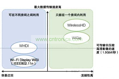 Wi-Fi Display、WiDi和WHDI因電波比較容易迂回,適用于在不同房間的連接,采用60GHz頻帶毫米波的WirelessHD和WiGig雖然可以確保傳輸速度,但如果有障礙物的話,電波難以到達(dá),因此主要在一個房間內(nèi)使用。