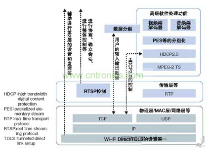 Wi-Fi Display是以無需經(jīng)由WLAN接入點(diǎn)即可在終端間直接通信的標(biāo)準(zhǔn)“Wi-Fi Direct”為基礎(chǔ),由上層的協(xié)議棧軟件構(gòu)成的安裝指南。鎖定終端服務(wù)的“服務(wù)發(fā)現(xiàn)(Service Discovery)”等的處理利用Wi-Fi Direct進(jìn)行,影像的壓縮/解壓處理及管理數(shù)據(jù)流的傳輸層等利用Wi-Fi Display處理(圖2)。壓縮/解壓采用H.264格式。由于最近的智能手機(jī)不但標(biāo)配WLAN功能,采用內(nèi)置H.264編解碼器電路GPU的終端也很多,因此Wi-Fi Display還具有易于配備到終端中的特點(diǎn)。“在受限于安裝面積和耗電量的智能手機(jī)中,無需追加硬件即可配備的優(yōu)勢非常大”(Cavium公司的柴田)。
