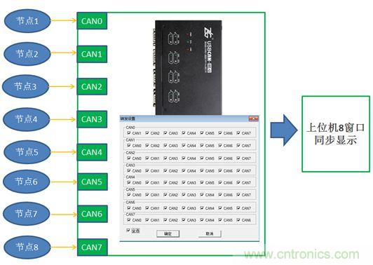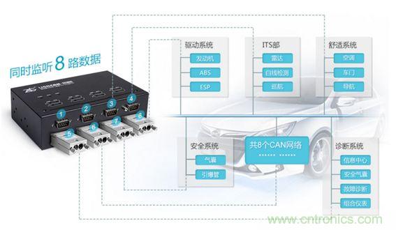 若將每個(gè)節(jié)點(diǎn)單獨(dú)取出做測(cè)試,則必然破壞原有通信規(guī)則。如何在不破壞原有通信的基礎(chǔ)上搞清楚一個(gè)陌生的收發(fā)協(xié)議呢?所謂工欲善其事,必先利其器。您需要一個(gè)能同時(shí)收發(fā)、轉(zhuǎn)送多路CAN數(shù)據(jù)的CAN卡,USBCAN-8E-U正是為這種應(yīng)用而生。
