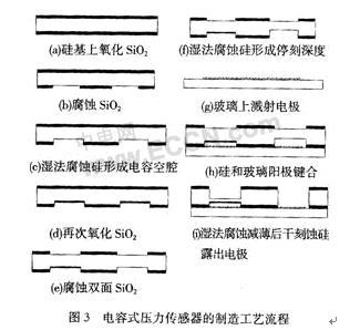整個制造流程都采用標準工藝,如圖3所示。先熱氧化100 nm的SiO2,既作為腐蝕Si的掩膜,又作為電容兩電極的絕緣層。利用各向異性腐蝕形成電容空腔和將來露電極的??滩郏绻杵穸纫恢虑襅OH腐蝕速率均勻,此法可以在相當程度上等效于自停止腐蝕。從玻璃上引出電容兩電極,然后和硅片進行陽極鍵合。鍵合片利用KOH腐蝕減薄后反應離子深刻蝕露出測量電極。