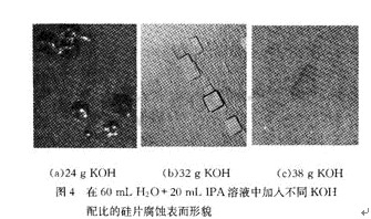 四棱錐和四棱臺的四個斜面對應于腐蝕速率最低的(111)系列晶面。當濃度較低時,(100)和(111)晶面的腐蝕速率比小,所以出現(xiàn)小丘;當濃度增大時,(100)和(111)晶面的腐蝕速率比增大,所以出現(xiàn)小坑;濃度達到一定程度后,(100)和(111)晶面的腐蝕速率比趨于穩(wěn)定,依然出坑,而(110)和(111)晶面的腐蝕速率比增大,從而產(chǎn)生斜坡。只有調(diào)整KOH的濃度,得到匹配的(100)、(110)、(111)晶面的腐蝕速率,才能獲得較好的腐蝕表面。試驗還表明,溫度主要影響腐蝕速率,對硅片腐蝕形貌影響不大。