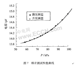 在室溫19.34℃的條件下,對壓力傳感器進行測量。測量設(shè)備為Druck的DPI610IS,測量電路采用了AD公司的AD7745電容測量芯片,精度能達到4 fF。測量曲線如圖7所示,測試精度為8.1‰。由于硅薄膜較厚,測量范圍內(nèi)的線性部分不多,此外電容電極的面積利用率不高使得電容的變化量也小,這些都是造成性能不高的主要原因,但由圖可以看出測量曲線存在很好的一致性和重復性。
