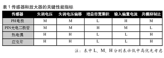 選擇放大器與傳感器正確接口時(shí),設(shè)計(jì)人員必須使放大器與傳感器特性匹配。可靠的放大器特性對(duì)于傳感器——放大器組合的工作是關(guān)鍵性的。傳感器和放大器的關(guān)鍵性能指標(biāo)見表1。例如,PH電極是一個(gè)高阻抗傳感器,所以,放大器的輸入偏置電流是優(yōu)先考慮的(表中的H)。PH傳感器所提供的信號(hào)不允許產(chǎn)生任何相當(dāng)大的電流,所以,放大器必須是在工作時(shí)不需要高輸入偏置電流的型號(hào)。具有低輸入偏置電流的高阻抗MOS輸入放大器是符合這種要求的最好選擇。另外,對(duì)于應(yīng)用增益帶寬乘積(GBP)是低優(yōu)先考慮(表1中L),這是因?yàn)閭鞲衅鞴ぷ髟诘皖l,而放大器的頻率響應(yīng)不應(yīng)該妨礙傳感器信號(hào)波形的真正再生。