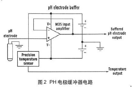 高阻抗PH傳感器可與具有低功率電路(僅需要2個(gè)1.5V電池供電)的放大器配對(duì)(圖2)。放大器MOS輸入晶體管為傳感器提供高阻抗,傳感器輸出阻抗為1MW或更大。此放大器的輸入偏置電流小于1pA,所以,放大器工作消耗非常小的電流。放大器的失調(diào)電壓小于1mV。放大器提供軌到軌工作并具有高驅(qū)動(dòng)能力,能在長(zhǎng)線上發(fā)送信號(hào)(放大器遠(yuǎn)離ADC的情況)。在電路中增加了一個(gè)精密溫度傳感器,可以測(cè)量PH傳感器的溫度。這使得具有精確的PH溫度補(bǔ)償值。