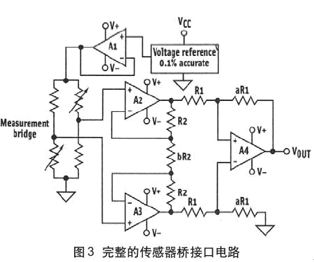 測(cè)量應(yīng)變片傳感器通常要通過橋網(wǎng)絡(luò),應(yīng)變片構(gòu)成橋的兩個(gè)(或4個(gè))臂。應(yīng)變片是低源阻抗器件,其輸出信號(hào)范圍是小的(幾百微伏~幾毫伏)。圖3所示的電路能為精確測(cè)量傳感器信號(hào)提供測(cè)量橋穩(wěn)定激勵(lì)電壓和高共模電壓抑制(CMR),消除了任何共模電壓。用高精度和非常低漂移(隨溫度)的精密電壓基準(zhǔn)驅(qū)動(dòng)放大器A1。這可為橋提供非常精確、穩(wěn)定的激勵(lì)源。因?yàn)楣材k妷捍蠹s為激勵(lì)電壓的一半,所以被測(cè)信號(hào)僅僅是橋臂之間小的差分電壓。放大器A2、A3、A4必須提供高共模抑制比(CMRR),所以僅測(cè)量差分電壓。這些放大器也必須具有低值輸入失調(diào)電壓(VOS)漂移(也稱之為失調(diào)電壓溫度系數(shù)TCVOS)和輸入偏置電流,以使得從傳感器能精確地讀數(shù)。放大器A1~A4連接成儀表放大器以達(dá)到上述目標(biāo)。這種配置的電壓增益(AV)為:AV=(1+2R2/bR2)(aR1/R1),其中a和b是確定總增益的比值。