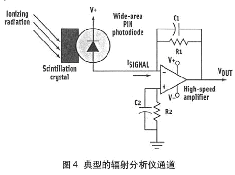 輻射譜測(cè)量來自輻射源的發(fā)射能量的分布,輻射源可以是粒子,X射線或γ射線。輻射照到閃光晶體上并發(fā)射強(qiáng)度正比于能量的短脈沖。然后由PIN光電二極管把光轉(zhuǎn)換為電流。放大器(見圖4)用做首置放大器和PIN光電二極管輸出的電流/電壓轉(zhuǎn)換器。此電路為用于基本輻射譜的單通道分析儀。信號(hào)的脈沖幅度包含重要信息,所以低輸入失調(diào)電壓和低失調(diào)電壓漂移是重要的。寬帶寬為處理脈沖(可窄到幾納秒)提供快速響應(yīng)。首置放大器輸出(VOUT)到脈沖幅度分析儀(如快速ADC)來測(cè)量和儲(chǔ)存每個(gè)峰值發(fā)生的數(shù)。分布是單個(gè)源的光譜。反饋電阻R1值取決于來自PIN光電二極管的最大電流和到ADC的最大輸出電壓。因此,R1=(Max VOUT)/(Max ISIGNAL)。電容C1用于PIN光電二極管寄生電容的補(bǔ)償。R2和C2相當(dāng)于R1和C1用于補(bǔ)償放大器非倒相輸入的輸入偏置電流。