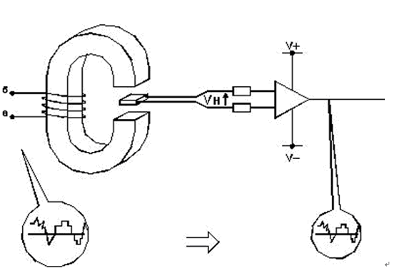 圖1.位于磁性電路間隙中的霍爾發(fā)生器把一次電流產(chǎn)生的磁場轉(zhuǎn)換成成比例的霍爾電壓。
