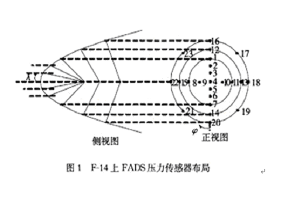 FADS一般安裝在飛行器前端,為了不影響雷達(dá)和火控裝置的安裝,也有將FADS安裝在機(jī)翼前端。F-14的FADS由23個(gè)壓力傳感器組成,安裝在機(jī)身前端。X-33的FADS系統(tǒng)則由6個(gè)壓力傳感器組成,安裝在機(jī)身前端。壓力傳感器的數(shù)目并沒(méi)有固定的規(guī)定。在F-14飛機(jī)上,其FADS的壓力傳感器布局如圖1所示。