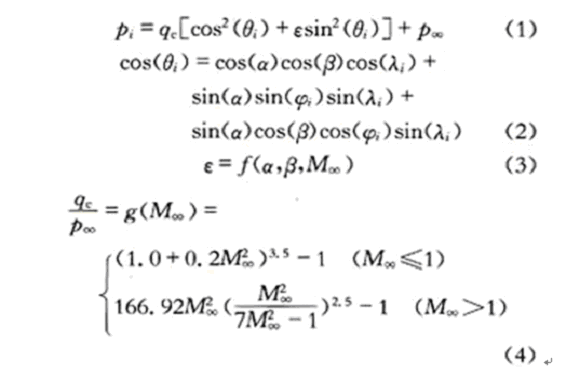 FADS系統(tǒng)的空氣動(dòng)力學(xué)模型把位流模型與修正的牛頓流模型(前者主要適用于亞音速條件,后者主要適用于超音速條件)與一個(gè)修正系數(shù)ε相結(jié)合,形成了不同馬赫情況下的帶補(bǔ)償?shù)目諝鈩?dòng)力學(xué)模型。ε的數(shù)值是在綜合考慮了壓縮效應(yīng)、氣動(dòng)外形、系統(tǒng)影響等因素而選取的。在飛行中,可以將其看成攻角、側(cè)滑角和馬赫數(shù)的函數(shù),其函數(shù)關(guān)系可以在飛行前確定。