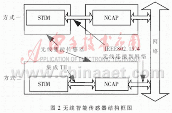 方案之一是無線STIM(智能傳感器接口模型):STIM與NCAP之間不再是TII接口(傳感器獨(dú)立接口),而是通過IEEE802.15.4無線(收發(fā)模塊)傳輸信息。傳感器或執(zhí)行器的信息由STIM通過無線網(wǎng)絡(luò)傳遞到NCAP終端,進(jìn)而與有線網(wǎng)絡(luò)相連。另外,還可以在NCAP與網(wǎng)絡(luò)間的接口替換為無線接口。