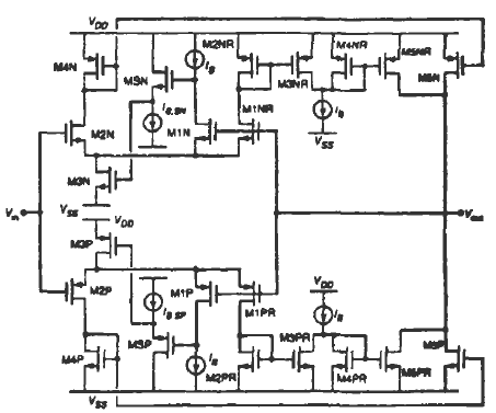 因此,這種緩沖器的工作過(guò)程可以這樣詳細(xì)描述如下:當(dāng)輸入信號(hào)Vin,在中部電源電壓區(qū),兩個(gè)輸入對(duì)MIP~M2P和MlN—M2N是有效的,M4P-M5P和M4N--M5N鏡像一個(gè)等于IB的電流到輸出支路。而且,電流IB的復(fù)制品通過(guò)晶體管MIPR(M1NR)和M2PR—M3PR(MlNR—M2NR)拷貝,給輸出支路底部的附加電路的電流源提供電流。因此,晶體管M4P和M5P(M4N和M5N)關(guān)斷,而且對(duì)輸出電流沒有任何貢獻(xiàn)。輸入信號(hào)接近VDD時(shí),PMOS輸入對(duì)關(guān)斷,而且反相輸入支路的復(fù)制品等等都關(guān)斷。MIPR--M3PR不對(duì)輸出支路的附加電路發(fā)送任何電流。這樣的話,M4PR和M5PR導(dǎo)通,從輸出支路吸收等于IB的電流,維持緩沖器是導(dǎo)通的。當(dāng)輸入信號(hào)Vin接近VSS時(shí),類似的情況也會(huì)發(fā)生。