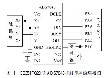 ADS7843是一種四線式觸摸屏控制器,目前較多應(yīng)用于電阻式觸摸屏輸入系統(tǒng)中。盡管有很多相關(guān)的典型應(yīng)用和應(yīng)用注意事項,但是在實際使用過程中仍然會遇到一些問題。應(yīng)用在通用的單片機(jī)中所出現(xiàn)的問題及解決方法,已有一些介紹。本文是對基于高速、流水線結(jié)構(gòu)的 C8051的觸摸屏控制系統(tǒng)設(shè)計中所遇到的問題進(jìn)行分析處理,并給出了解決方法。