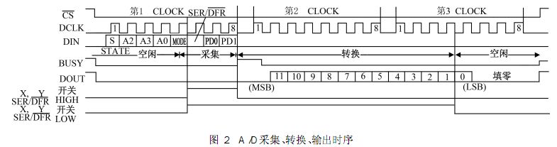 如圖 1示。ADS7843串行接口的一次完整操作需要 3× 8=24個 DCL K時鐘周期,前 8個脈沖接收 8位的命令,并在第 6個脈沖的上升沿開始 A / D轉(zhuǎn)換器進(jìn)入采樣階段,從第 9個脈沖開始進(jìn)入轉(zhuǎn)換階段,輸出12位采樣值,轉(zhuǎn)換結(jié)束進(jìn)入空閑階段。直到 24個DCL K結(jié)束,CS置高電平,一次測量結(jié)束。如圖 2所示。此外,ADS7843還支持其他的工作方式,這里不再詳述。