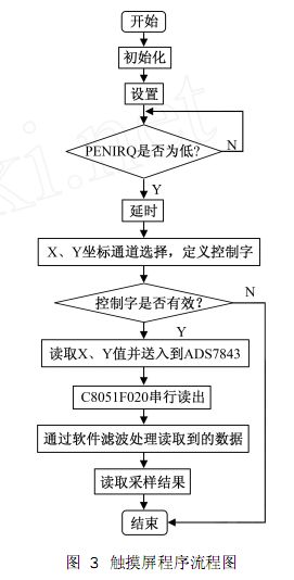 當(dāng)用戶在觸摸屏上的有效區(qū)域內(nèi)點擊時,觸摸屏的 X方向、 Y方向輸出電阻分別隨 X和 Y呈線性變化,ADS7843控制器將其分別轉(zhuǎn)換為 12位數(shù)據(jù),通過中斷告知 C8051F020需要接收數(shù)據(jù),C8051F020接收到數(shù)據(jù)后進(jìn)行處理;首先進(jìn)行觸點數(shù)據(jù)是否有效判斷,包括兩方面:一是判斷是否誤操作,即是否是由于人的抖動產(chǎn)生的錯誤數(shù)據(jù);二是 ADS7843傳過來得數(shù)據(jù)是否有效,由于剛開始的傳過來的第一個坐標(biāo)是用戶開始接觸觸摸屏?xí)r產(chǎn)生的,電阻不準(zhǔn)確,導(dǎo)致數(shù)據(jù)也不準(zhǔn),通常要去掉;在接收過程中采用多次平均的方法,假如有一次接收的數(shù)據(jù)和平均值差別很大,則這次測量就作廢,需要重新測量。一旦數(shù)據(jù)有效,C8051F020接著計算觸點坐標(biāo)落在液晶屏的位置,根據(jù)計算的結(jié)果判斷執(zhí)行相應(yīng)的功能函數(shù)。使觸摸屏和液晶屏有機(jī)的結(jié)合起來,建立一定的邏輯關(guān)系,交互地進(jìn)行信息存取和輸出。[page]
