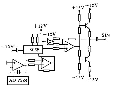 控制器的激勵(lì)信號(hào)源如圖3 所示。信號(hào)由函數(shù)信號(hào)發(fā)生器8038 產(chǎn)生,它能夠輸出正弦波和方波,正弦波用作觸摸屏的激勵(lì)信號(hào)。單片機(jī)通過 8 位 D/ A 轉(zhuǎn)換器可控制8038 的振蕩頻率,一般控制在200 kHz 左右,以避開計(jì)算機(jī)顯示器掃描信號(hào)產(chǎn)生的干擾。同時(shí),由8038 產(chǎn)生的方波信號(hào)提供給模擬解調(diào)器,作為解調(diào)信號(hào)參考源。由于8038輸出的正弦波信號(hào)功率有限,為此在8038的正弦波信號(hào)輸出端增加了功率放大電路。