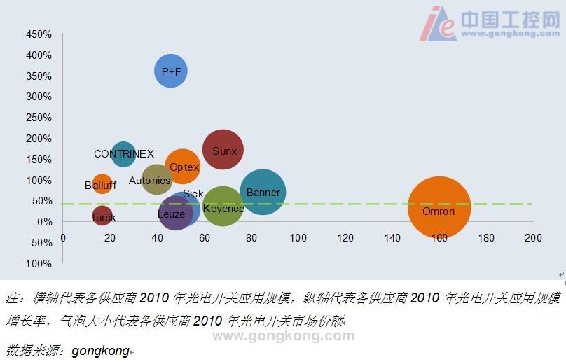 從廠商角度來(lái)看,各主流廠商表現(xiàn)的差異非常大。部分廠商,如Autonics、IFM光電開(kāi)關(guān)和接近開(kāi)關(guān)銷(xiāo)售業(yè)績(jī)的增長(zhǎng)幅度在100%以上,而還有部分廠商增長(zhǎng)只有10%左右。相比之下,編碼器的主流廠商業(yè)績(jī)?cè)鲩L(zhǎng)幅度雖然也有差距,但是差距相對(duì)較小,增長(zhǎng)幅度最大的為60%,增長(zhǎng)幅度最小的低于10%。但這些變化未改變傳感器市場(chǎng)的整體格局,Omron以全面的產(chǎn)品系列和普遍的實(shí)用性立足于大眾化市場(chǎng),市場(chǎng)份額仍遙遙領(lǐng)先于其他企業(yè)。歐美系品牌中,Turck、Sick和Banner定位于高端市場(chǎng),以先進(jìn)的技術(shù)和穩(wěn)定的質(zhì)量贏得冶金、汽車(chē)、物流等高端客戶的青睞。