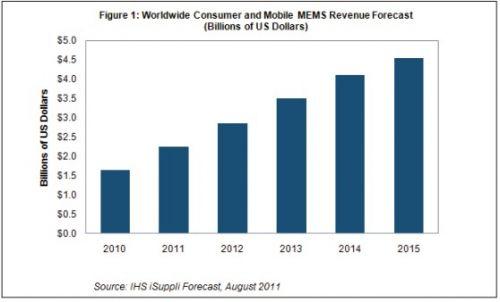 據(jù)IHS公司的消費(fèi)與移動MEMS市場研究報告,微機(jī)電系統(tǒng)(MEMS)市場中最大和最有活力的領(lǐng)域是消費(fèi)與移動器件,通過積極開拓智能手機(jī)和平板應(yīng)用,2011年MEMS市場將再度實現(xiàn)創(chuàng)紀(jì)錄的增長率。
