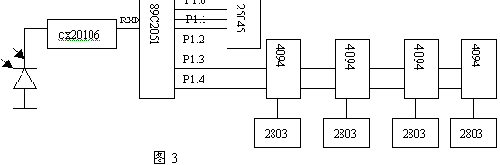 接收器部分,主要由CX20106和89C2051、顯示驅(qū)動(dòng)4094、2803及數(shù)據(jù)存儲(chǔ)器和看門狗25045組成,用解碼芯片CX20106把38K的載波過濾后,得到一組波形,即以波特率為1200的串口數(shù)據(jù),直接送至89C2051的RXD接收,用軟件讀取串口,輸入緩存,得到一組數(shù)據(jù),判斷正確后,存放在非易失性的EEPROM25045中,同時(shí)直接用脈沖移位方式,送數(shù)據(jù)至4094,經(jīng)2803驅(qū)動(dòng)后顯示,同時(shí)用25045的看門狗定時(shí),保證在程序失控等情況下,能正確返回而不造成錯(cuò)誤接收。由于串行口方式傳輸,本身帶有奇偶校驗(yàn)和起停位校驗(yàn),可以大大提高數(shù)據(jù)的可靠性,同時(shí)在數(shù)據(jù)組中還加入了累加和校驗(yàn),再次提高了可靠性,因此在實(shí)際應(yīng)用中,即使在露天、太陽(yáng)直射、光照很強(qiáng)等惡劣環(huán)境下,都能保證不會(huì)誤收數(shù)據(jù)而造成顯示錯(cuò)誤。其原理圖如下:
