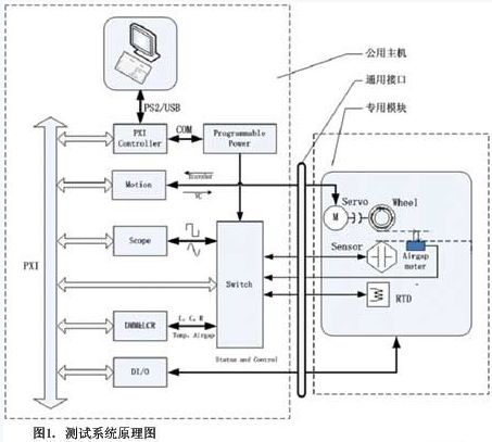 目前,汽車傳感器沒有一個統(tǒng)一的行業(yè)標準,基本是按照使用者的要求定制。譬如目標輪及其轉速、空氣氣隙和傳感器的安裝尺寸各不相同,即使是傳感器裝配到同一種車型上,也會隨著安裝位置的不同而存在差異。但是,同一臺設備不可能滿足全部傳感器的測試要求,由此引入模塊化的設計思想,即系統(tǒng)中相同的部分,如測試儀器、測試軟件、氣動控制系統(tǒng)、主電路系統(tǒng),作為公用資源(這里稱為“主機”);對系統(tǒng)中要求隨著傳感器變化的部分,如目標輪及馬達、夾具及專用電路,被看成模塊。主機和模塊之間采用快插的方式完成電氣連接且為標準化接口,可進行后續(xù)擴展。當測試不同傳感器時,選用不同的測試模塊連接到主機上即可。