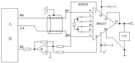圖1是INA115在心電檢測電路中的實用電路。放大器的正負(fù)輸入通過心電傳感器分別接到人體的左臂(LA)與右臂(RA)上,與運(yùn)放N和電阻R1~R4組成的驅(qū)動網(wǎng)絡(luò)接到人體的右腿(RL)上,構(gòu)成“浮地”。由于生物信號很弱,加之有極化電位,所以該級的放大倍數(shù)不宜太高,一般取在10~100之間,并且只能作為前置放大用,為了檢測安全,后級一般應(yīng)再采用隔離放大電路進(jìn)行隔離,且該級的電源電壓最好應(yīng)采用隔離電源模塊進(jìn)行提供,以達(dá)到電源及信號的完全隔離。如圖2所示,