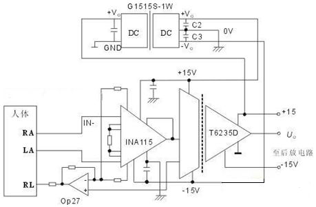 以上電路是由漢為公司的T6235D與INA 115等組成的隔離型心電檢測前置放大電路,該電路由于其具有輸入阻抗高、漏電流小、檢測精度高和滿足人體安全等指標(biāo)完全可以達(dá)到醫(yī)療器械使用的要求標(biāo)準(zhǔn)。該電路一般作為前置放大電路,器件直接與人體接觸,并拾取心電信號后通過INA115進(jìn)行放大,最后由ISO122隔離傳輸?shù)胶笾梅糯箅娐?,實現(xiàn)人體信號與輸出及電源的隔離放大。