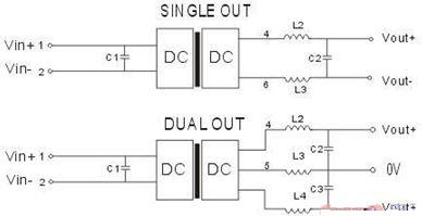 3、 由于DC/DC電源模塊是采用開關(guān)振蕩電路來實現(xiàn)的,其自身也會產(chǎn)生共模、差模噪聲的干擾,對于對紋波噪聲要求較高的場合可在DC/DC電源模塊的輸出端外接無源LC濾波網(wǎng)絡(luò)或RC(損耗較大),以進(jìn)一步降低電源紋波噪聲,但是要注意L自身諧振頻率要遠(yuǎn)高于模塊的開關(guān)頻率,允許通過的電流值最好在模塊輸入電流的兩倍以上,內(nèi)阻要小,以降低直流損耗。具體可參考下圖:
